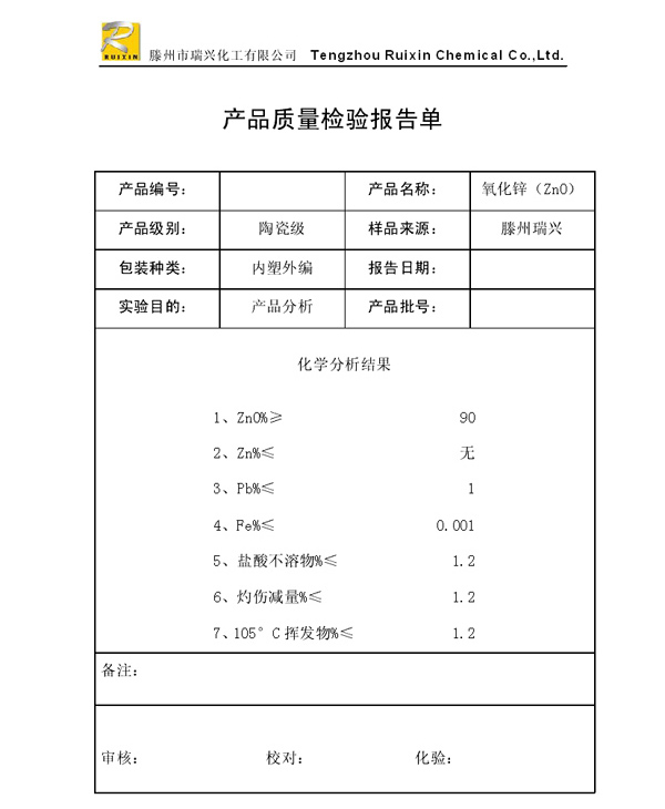 瑞興化工有限公司是生產氧化鋅的重點企業,于2008年通過ISO9001:2008質量管理體系認證?!叭鹋d”牌氧化鋅在國內擁有較大穩定的市場,并遠銷東南亞、中東、中南美等國家和地區,在國內外享有較高聲譽。